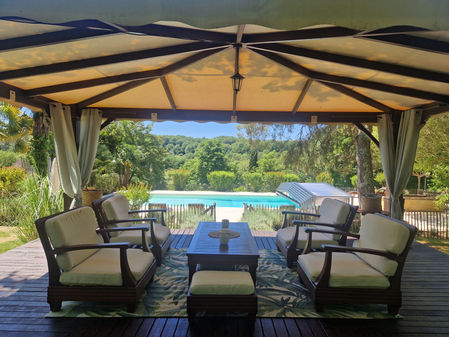 Située au milieu de la pelouse principale la piscine du Château La Carrière, mesure 12m x 6m avec un bassin de profondeur maximale de 2,1m. De là, vous avez une vue imprenable sur la vallée et vous pouvez profiter de magnifiques couchers de soleil. La piscine est entourée de fleurs, de plantes et d’arbustes colorés qui forment un cadre unique et enchanteur. La piscine est équipée de nombreuses chaises longues en bois, ainsi que de tables, chaises et repose-pieds assortis. Pour garantir la sécurité de vos enfants, la piscine est entourée dans son intégralité par une clôture rustique. À côté de la piscine, se trouve un élégant pavillon où vous abriter du soleil en cas de besoin. Derrière le pavillon, vous trouverez le Pool House, une cabane octogonale dotée de grandes fenêtres pouvant chacune être ouverte. Le Pool House dispose d’une douche, de toilettes, d’une cuisine.